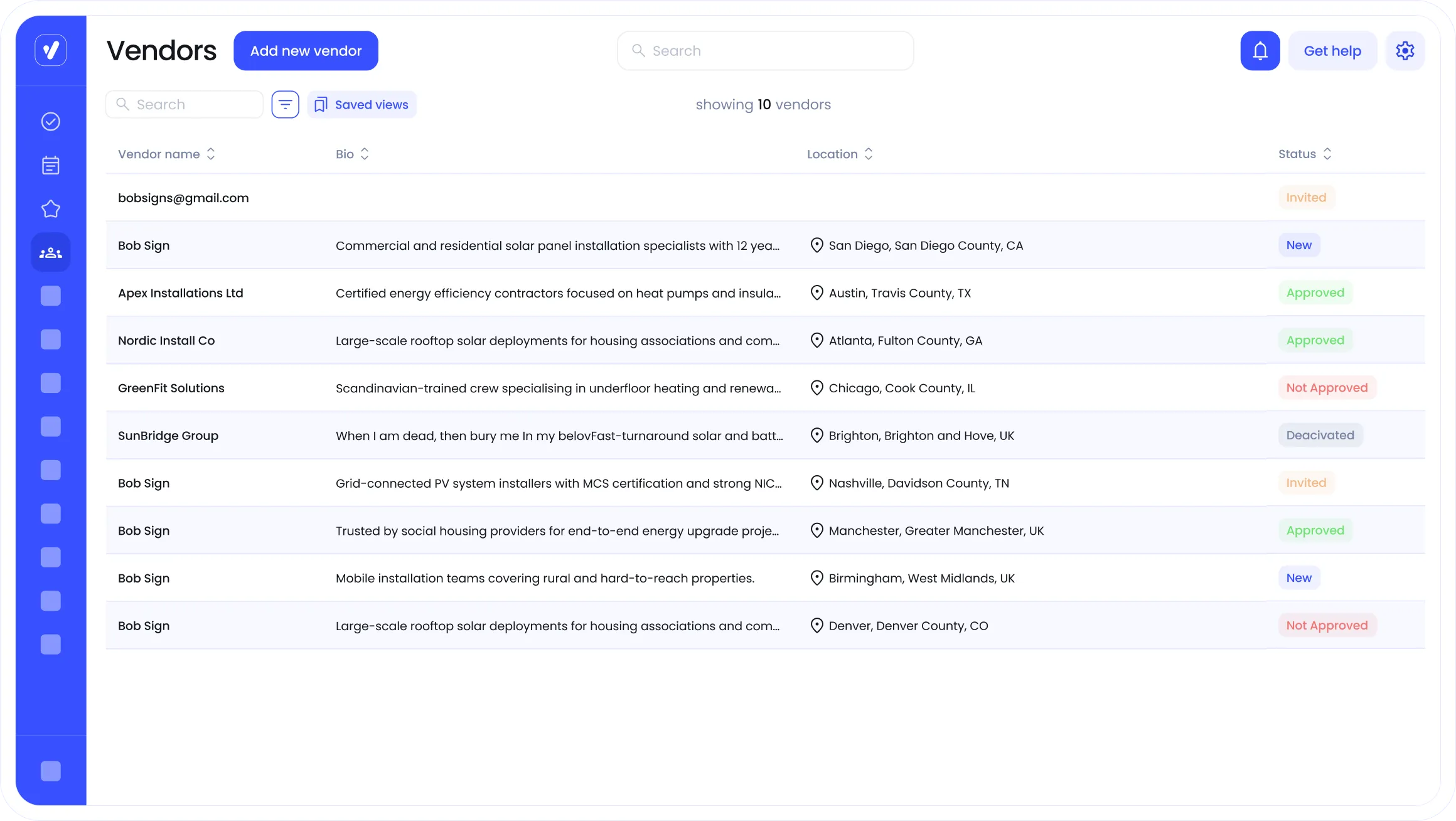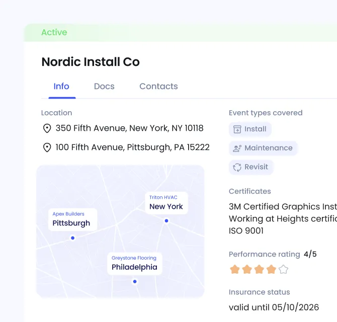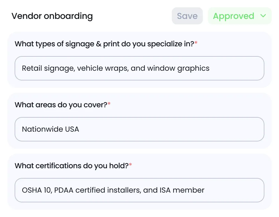Vendors fill out their profiles during onboarding, giving you full visibility into their skills, coverage areas, insurance and certifications.