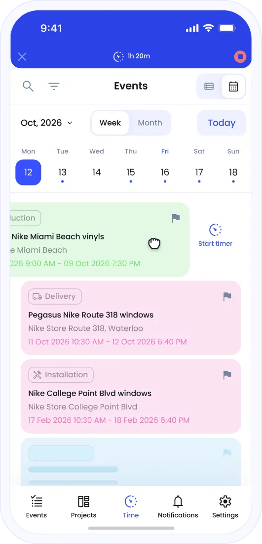 Teams clock in and out on the mobile app. Every hour is captured against the right job.